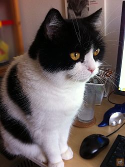 Sitze ich am Schreibtisch und Elvis will meine Aufmerksamkeit, wendet er seinen „Hypnosetrick“ an.  Er springt auf den Tisch, setzt sich vor mich hin und starrt mich mit seinen großen gelben Augen an. Funktioniert immer! Ich lasse Arbeit Arbeit sein und Elvis bekommt seine Streicheleinheiten oder wir spielen zusammen.