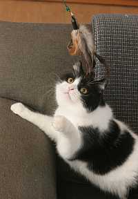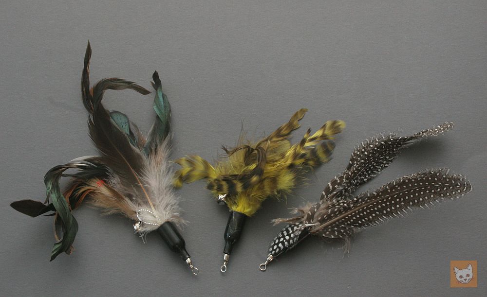 Elvis spielt ausgesprochen gern mit Federwedeln oder mit Katzenangeln. Ich habe mich allerdings schon oft über Spielangeln geärgert, bei denen sich nach kurzer Zeit die Federn gelöst haben. Auch mit den Stäben ist es so eine Sache: Oft sind sie zu kurz oder die Steckverbindung bei langen Stäben hält nicht richtig.