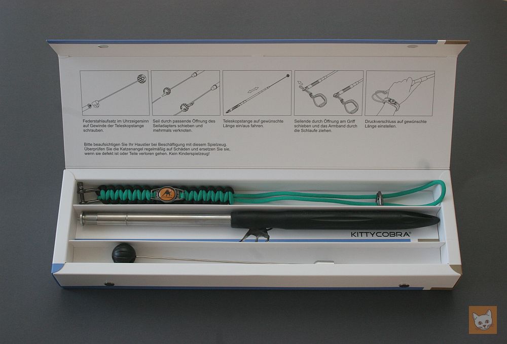 Die Kittycobra kommt in einer soliden Schachtel daher und das Auspacken ist ein Erlebnis für sich. Ich habe noch nie ein so hochwertig verpacktes Katzenspielzeug gesehen. Auf der Deckelinnenseite der Schachtel ist eine Anleitung zum Zusammenbauen der Spielangel aufgedruckt.