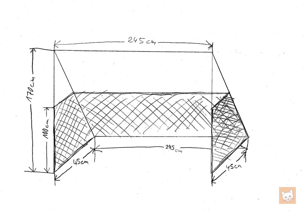 Aus der Befestigung ergibt sich ein trapezförmiger Grundriss, wie ihr in der Zeichnung sehen könnt. Vielleicht habt ihr euch schon gewundert, dass ich in diesem Artikel immer in der Wir-Form schreibe. Das Katzennetz hat nämlich mein Mann entworfen, und auch diese Skizze stammt von ihm: