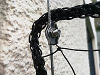 Die Drahtseile zum Aufspannen des Katzennetzes haben wir im Baumarkt gekauft. Sie haben eine Stärke von 2 Millimetern. Jeweils ein Seil wurde oben um die Halterung der Markise geschlungen und unten an den Halterungen für die Glasscheiben fixiert. Zum Befestigen der Drahtseile haben wir Seilklemmen verwendet.