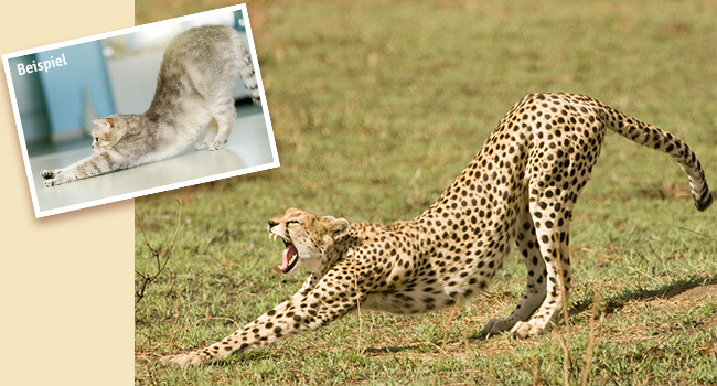 Sicher habt ihr auch schon oft beobachtet, dass eure Miezen genau die gleichen Posen einnehmen wie ihre wilden Verwandten. Auf der Website von Wildcat findet ihr zwei Geparden-Motive zur Auswahl. Wählt eines der beiden Motive aus und macht ein Foto von eurer Katze mit einer möglichst ähnlichen Bewegung. Hier seht ihr einen Geparden beim „Stretching“ und einen Stubentiger in der gleichen Pose: